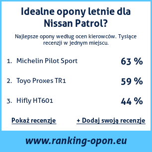 Rankingi, recenzje i opinie letnich opony dla Nissan Patrol. Nasi użytkownicy najchętniej wybierają dla tego samochodu opony w rozmiarze 225 45 R17, 265 70 R16, 315 75 R16, 225 45 R15, 285 75 R16. Przegląd recenzji letnich opony dla Nissan Patrol od kierowców to jak najbardziej obiektywne informacje pomagające przy wyborze letnie opon. Im więcej recenzji, tym opinia dokładniejsza i wiarygodniejsza. Kładziemy nacisk na to, żeby recenzje były jak najbardziej obiektywne.