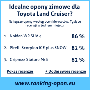 Jeśli jesteś właścicielem strony o tematyce motoryzacyjnej lub jesteś dostawcą opon, możesz na swojej stronie umieścić nasz banner z oceną opon odpowiednich dla samochodu Toyota Land Cruiser: ranking opon na Toyota Land Cruiser [png] ![]()
